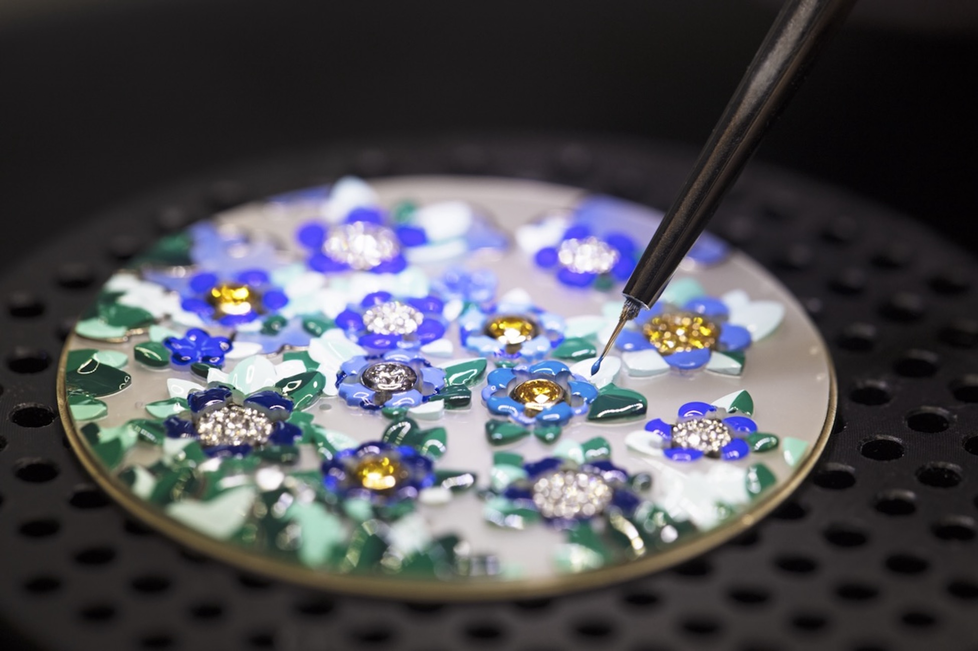 Là người chiến thắng Giải thưởng Đồng hồ Nữ Phức tạp Danh giá tại Grand Prix d’Horlogerie de Genève 2024, tuyệt tác Lady Arpels Brise d’Été gợi lên sự nhẹ nhàng của một cơn gió mùa hè giữa thiên nhiên. Với tác phẩm này, Van Cleef & Arpels thể hiện trình độ bậc thầy của mình trong một loạt các ngành nghề thủ công nghệ thuật, kết hợp các kỹ thuật như khảm đá quý, tráng men plique-à-jour và vallonné. Các phương pháp này hoạt động như những nét cọ vẽ nên một khung cảnh sống động: Cánh bướm và ngọn cỏ được thể hiện bằng men plique-à-jour tinh tế, mang lại cho chúng chất lượng trong mờ, trong khi cánh hoa chế tác bằng men vallonné sẽ có bề mặt cong vòm, căng mọng.
