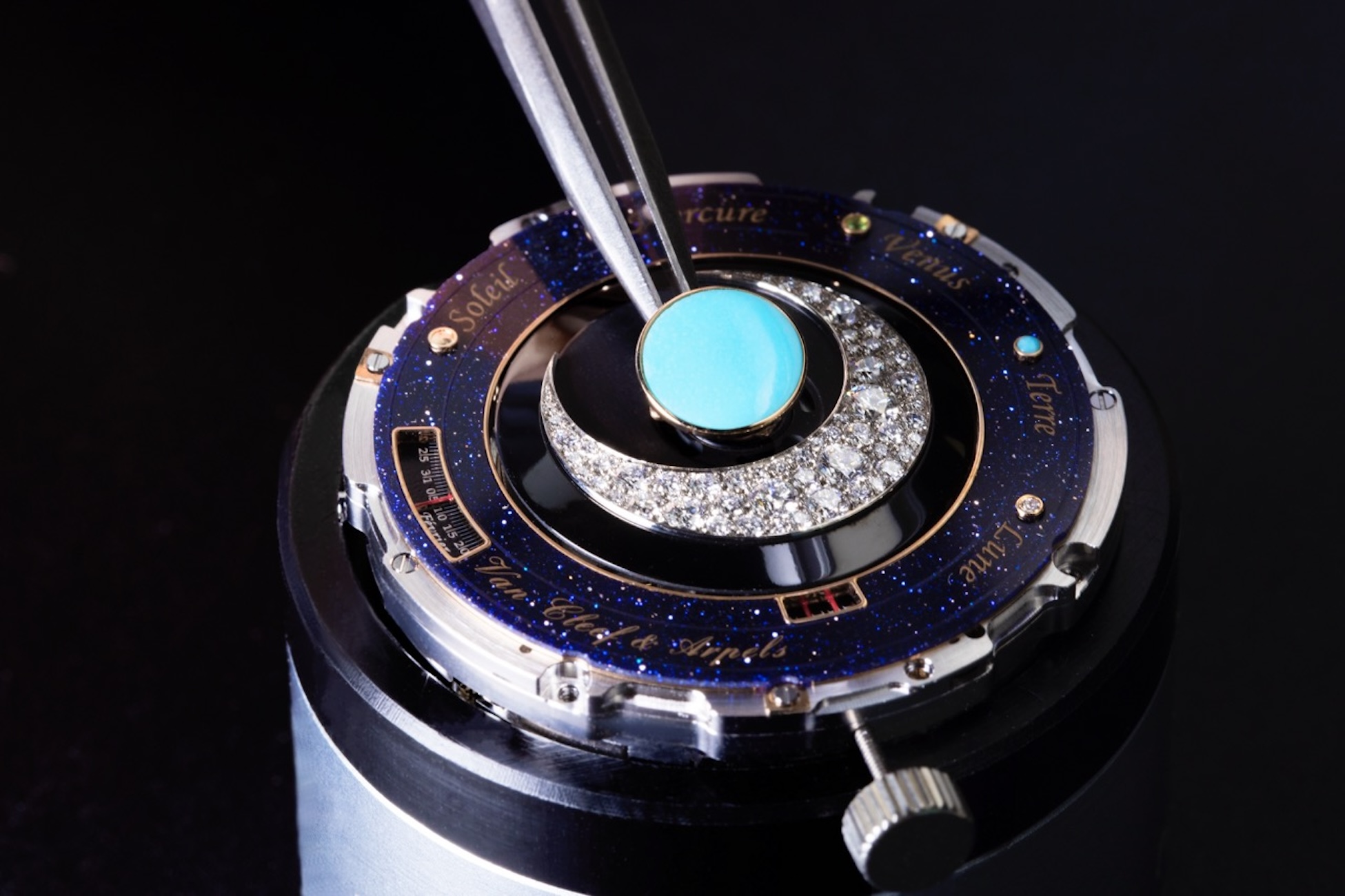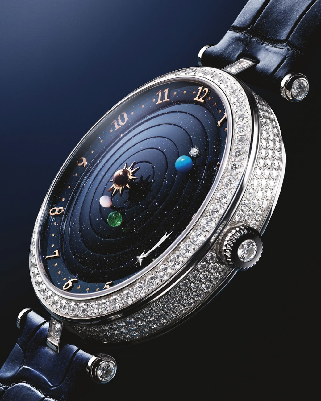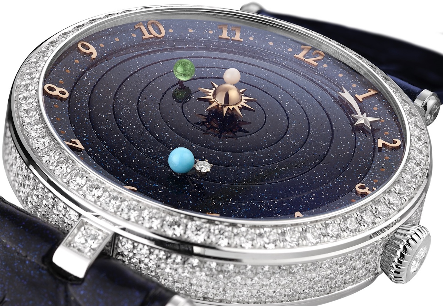 Tuyệt tác Lady Arpels Planétarium là một đại diện hoàn hảo cho tầm nhìn này. Đặt trên mặt số bằng kính aventurine xanh thẳm, lấp lánh như bầu trời đêm, chiếc đồng hồ có bảy vòng tròn đồng tâm thể hiện chuyển động theo thời gian thực của các hành tinh. Mỗi thiên thể được chế tác từ một vật liệu tinh xảo khác nhau: Kim tinh bằng men xanh, Trái đất bằng ngọc lam, Thủy tinh bằng xà cừ hồng, Mặt trời bằng vàng điêu khắc và Mặt trăng là một viên kim cương tự quay quanh Trái đất trong 29,5 ngày. Một ngôi sao băng bằng vàng quay quanh mặt số mỗi 12 giờ để chỉ báo thời gian hiện tại, một nét chấm phá mang lại vẻ đẹp thiên thể hoàn hảo cho cỗ máy thời gian.