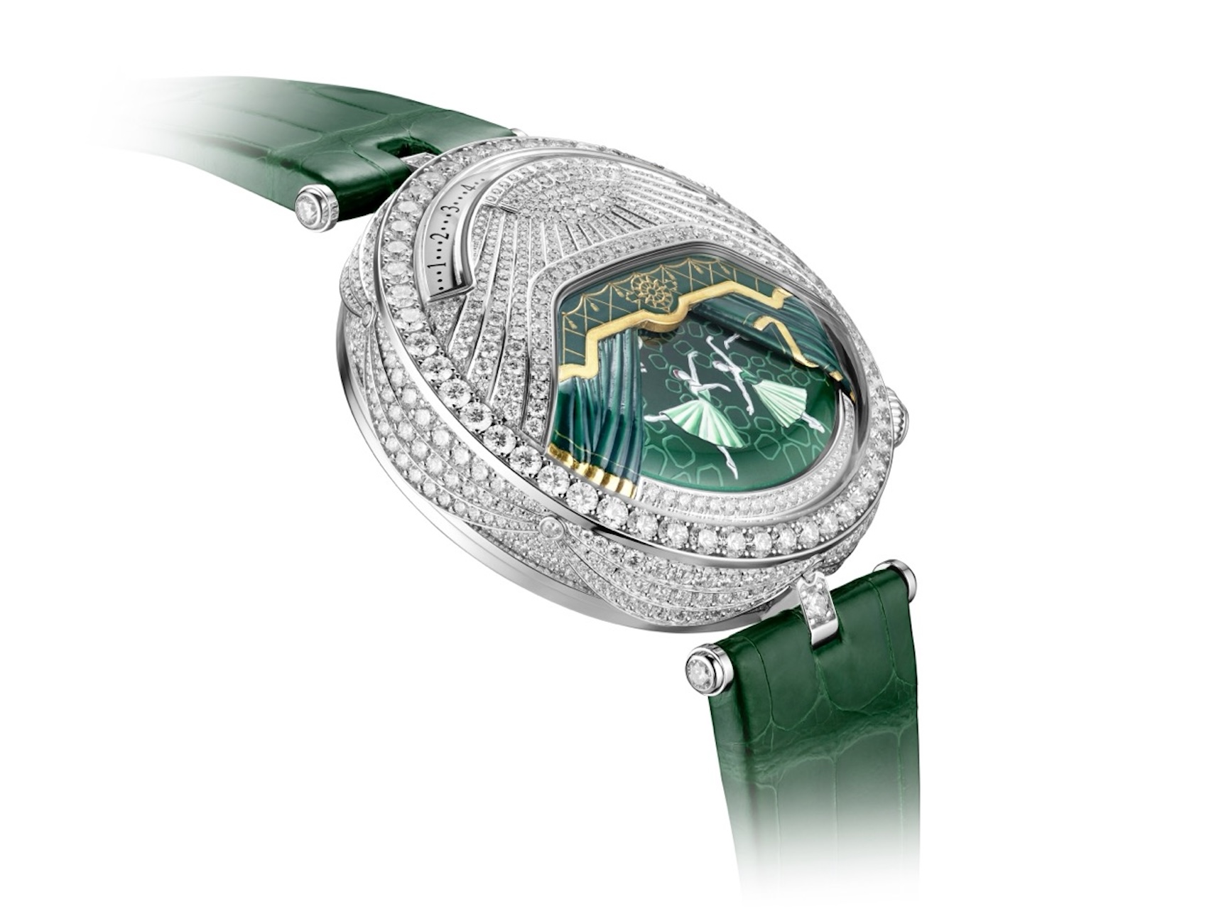 Nhà chế tác tiếp tục khiêu vũ theo cách riêng của mình vào trái tim chúng ta với một loạt ba cỗ máy thời gian: Lady Arpels Ballerines Musicales sử dụng kỹ thuật khảm đá quý, tiểu họa và một cơ chế hoạt họa phức tạp kết hợp hộp nhạc và điểm chuông để tạo ra một vũ khúc lay động mọi giác quan. Có sẵn trong một bộ ba, mỗi phiên bản Lady Arpels Ballerine Musicale Émeraude với tông màu xanh lá cây, Rubis màu đỏ và cuối cùng là Diamant màu xanh lam đều tôn vinh ba màn của vở ballet Jewels. Nổi tiếng là biên đạo múa George Balanchine đã phát triển Jewels vào những năm 1960 sau cuộc gặp gỡ với Claude Arpels, người mà ông có chung niềm đam mê với đá quý.