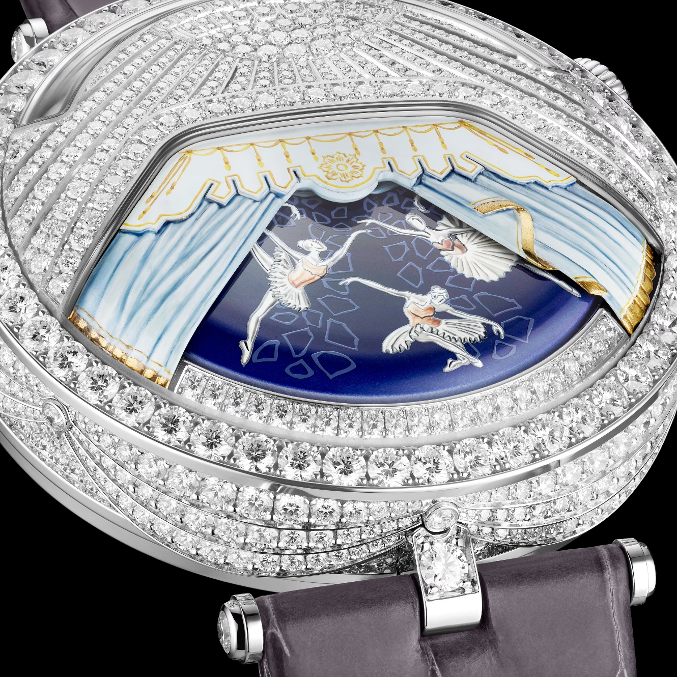 Các chi tiết của chiếc đồng hồ thực sự tinh xảo, từ những nếp gấp ấn tượng của tấm màn sân khấu hé mở để lộ những vũ công ballet được vẽ tay. Họ xoay tròn trên sân khấu, theo giai điệu của âm nhạc. Không giống như một cơ chế điểm chuông chu kỳ, hộp nhạc này có thể chơi một loạt các nốt nhạc. Thu nhỏ kỳ quan kỹ thuật này vào một chiếc đồng hồ đeo tay thực sự là một kỳ công phi thường, một kỳ công mất 10 năm để thực hiện.