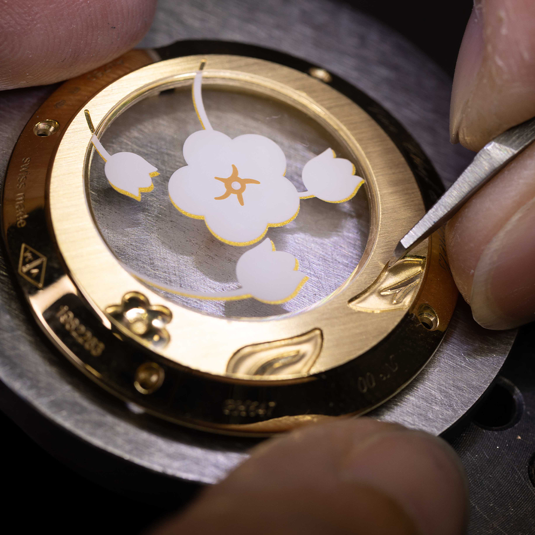 Mặt số của chiếc đồng hồ là một khung cảnh thiên nhiên được thu nhỏ theo cách diệu kỳ. Ba đóa hoa mận bằng xà cừ trắng được sắp đặt trên nhiều tầng, tạo hiệu ứng nổi khối rõ rệt.