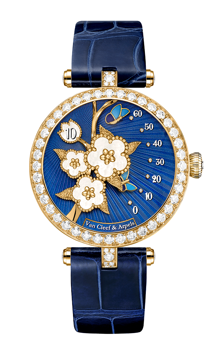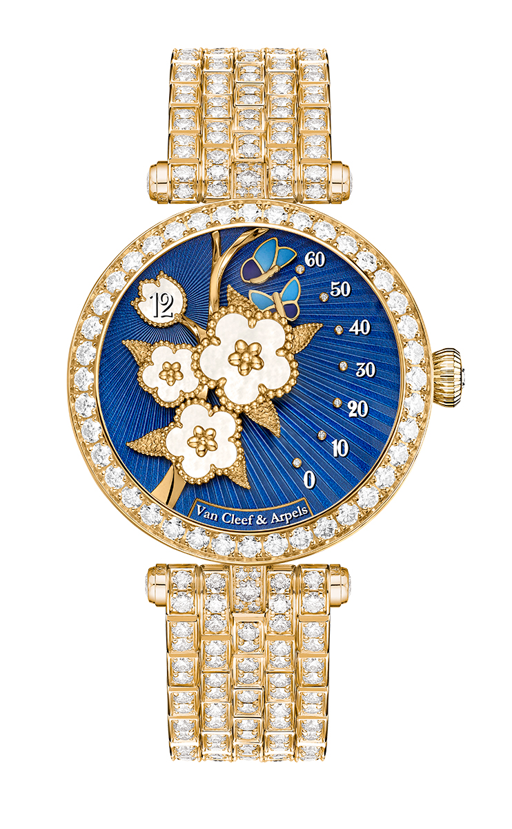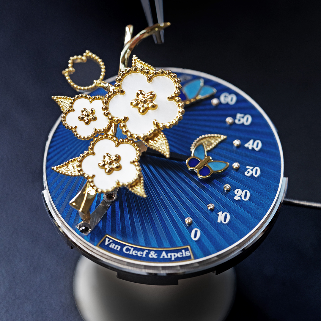 Kim cương được đính tại nhiều vị trí trên đồng hồ, từ viền bezel, cọc số, núm vặn cho đến khóa dây, tất cả đều được tuyển chọn theo những tiêu chí nghiêm ngặt nhất về màu sắc và độ tinh khiết. Nắp lưng đồng hồ tiếp tục câu chuyện với họa tiết lá cây được chạm khắc trên chất liệu vàng, kính sapphire trang trí bằng decal men hoa, và rotor được guilloché tỏa tia, điểm xuyết hình ảnh cánh bướm vẽ thu nhỏ. Toàn bộ chiếc đồng hồ được lắp ráp tại xưởng chế tác của Van Cleef & Arpels ở Geneva – nơi kỹ thuật cơ khí và métiers d’art hội ngộ trong sự cân bằng hoàn hảo.