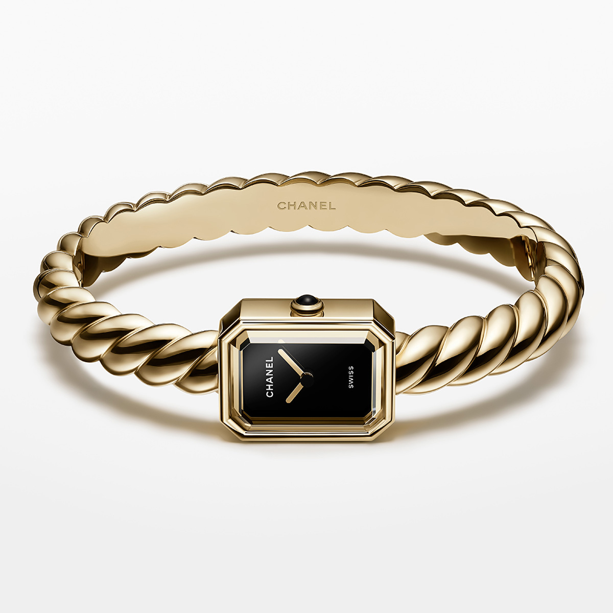 Dây đeo của Première Galon là một chiếc vòng tay cứng được tạo hình theo một dải viền bện xoắn, mang đến cách đeo, một dấu ấn phong cách hoàn toàn mới. Chiếc vòng tay bằng vàng 18k này tôn lên vẻ đẹp thuần khiết của mặt số sơn mài đen, được giải phóng khỏi mọi cọc số, hiện lên như một mặt hồ tĩnh lặng, thuần khiết. Thiết kế tối giản này không chỉ tôn vinh vẻ đẹp của bộ vỏ bát giác lấy cảm hứng từ quảng trường Place Vendôme, mà còn là một triết lý sâu sắc về thời gian: Thời gian là để cảm nhận, không phải để đo đếm.