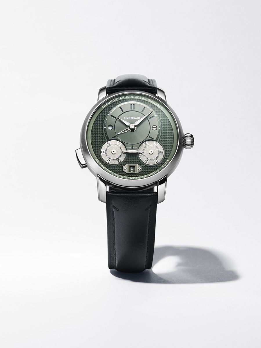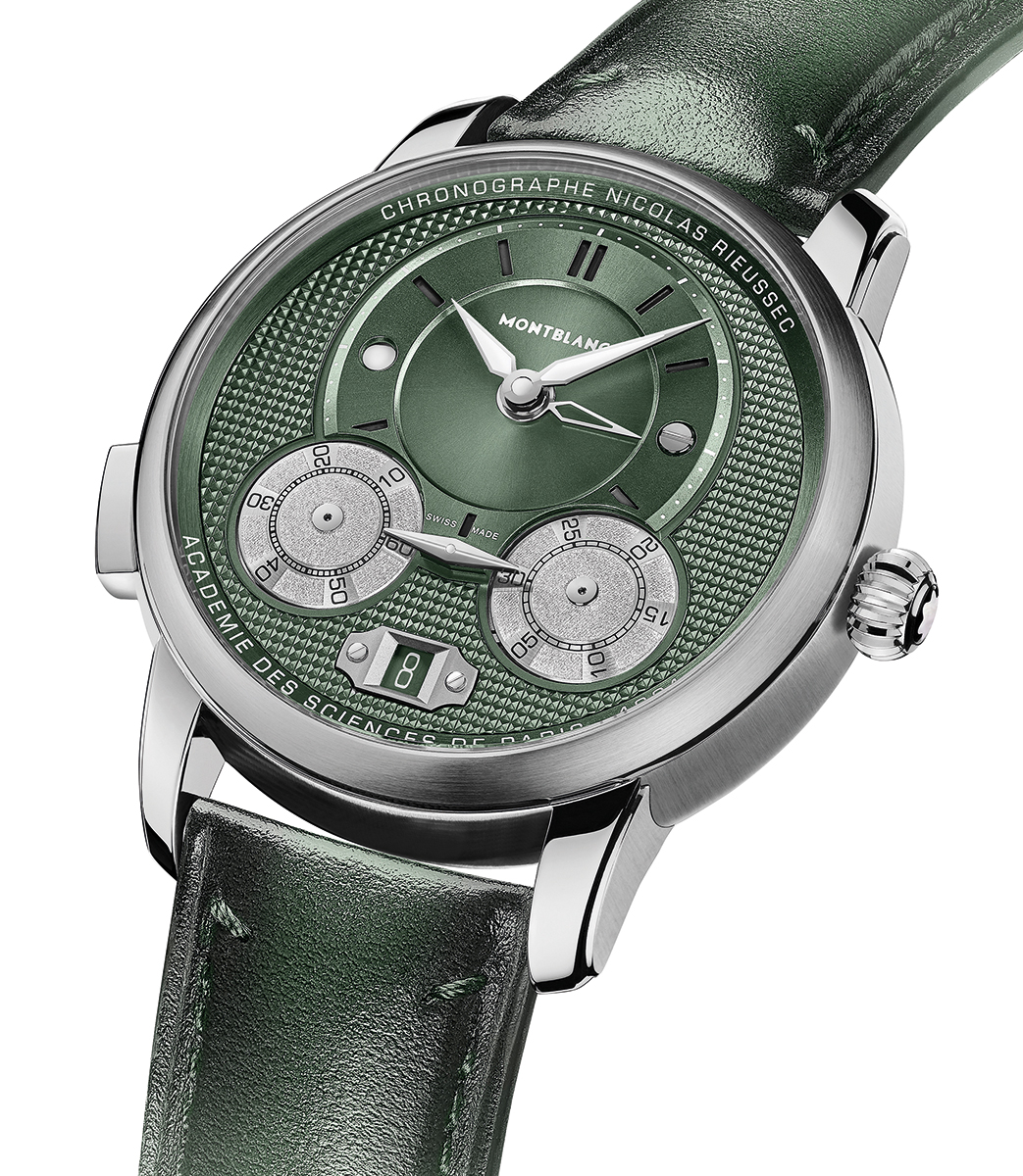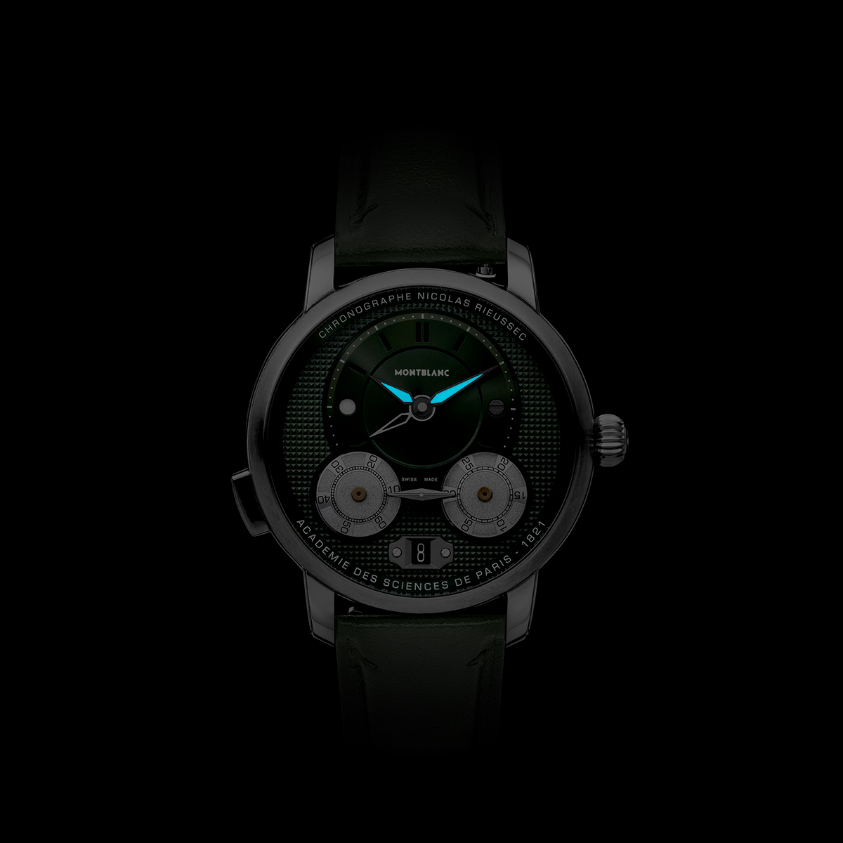 Năm nay, Montblanc tiếp tục tri ân phát minh kinh điển của Nicolas Rieussec với phiên bản mới 43mm bằng thép, nổi bật cùng mặt số xanh thanh lịch và dây đeo da bê xanh có thể thay thế, được chế tác với hiệu ứng chuyển sắc dọc sfumato tinh tế.