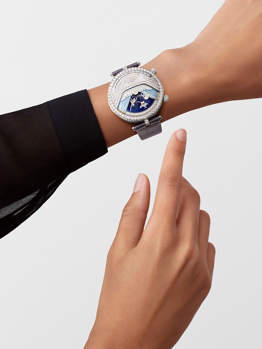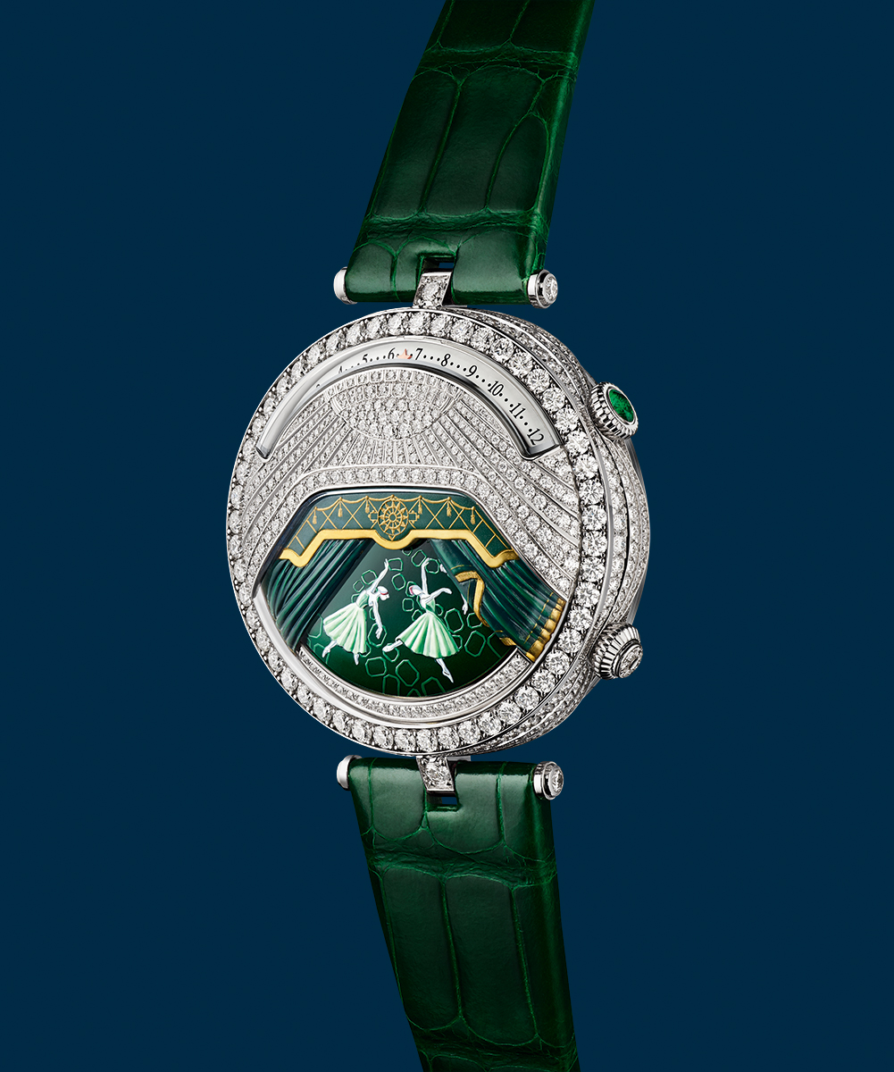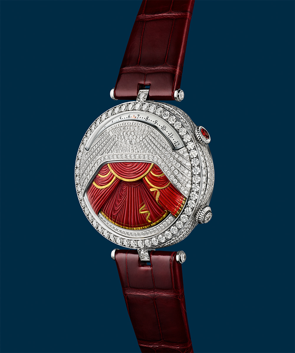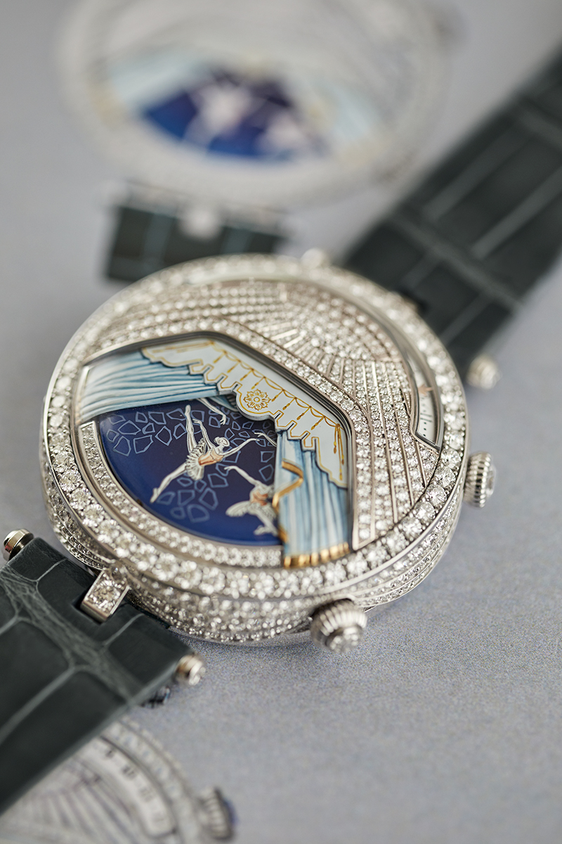 Mặt số phía trên được nạm kim cương, gợi hình ảnh đèn chùm lấp lánh và những tấm rèm sang trọng, chiếu sáng toàn bộ mặt số, nơi màu sắc được thể hiện nhờ các kỹ nghệ thủ công đặc trưng: Chạm khắc, khắc nổi và vẽ tay. Những lớp rèm được xử lý tinh xảo hé lộ hình ảnh các vũ công ballet trong kỹ thuật miniature painting.