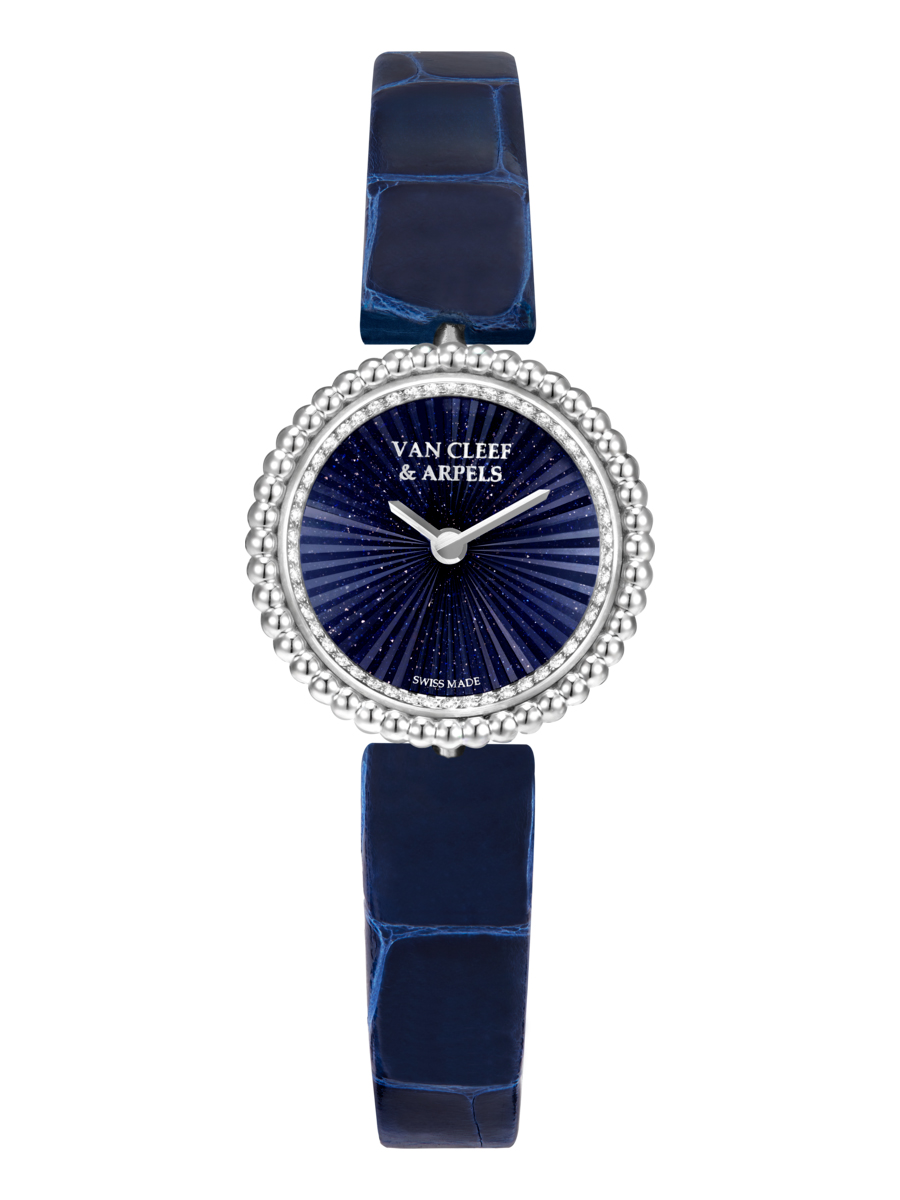 Tạo tác khoe dáng tròn được viền bởi hai hàng hạt vàng đánh bóng tỉ mỉ để phô bày trọn vẹn ánh sáng. Dưới lớp kính hơi cong, mặt số hé lộ họa tiết bằng kính aventurine, nơi những sắc xanh thẫm của nửa đêm phản chiếu chiều sâu vô biên của vũ trụ. Chất liệu này được hoàn thiện bằng phương pháp guilloché tỏa tia – một kỹ thuật mới mẻ giúp làm giàu thêm những chuyển động của ánh sáng. Sự lấp lánh mãnh liệt ấy truyền thêm sinh khí cho thời gian, được đo đếm bằng những bộ kim chắc gọn.