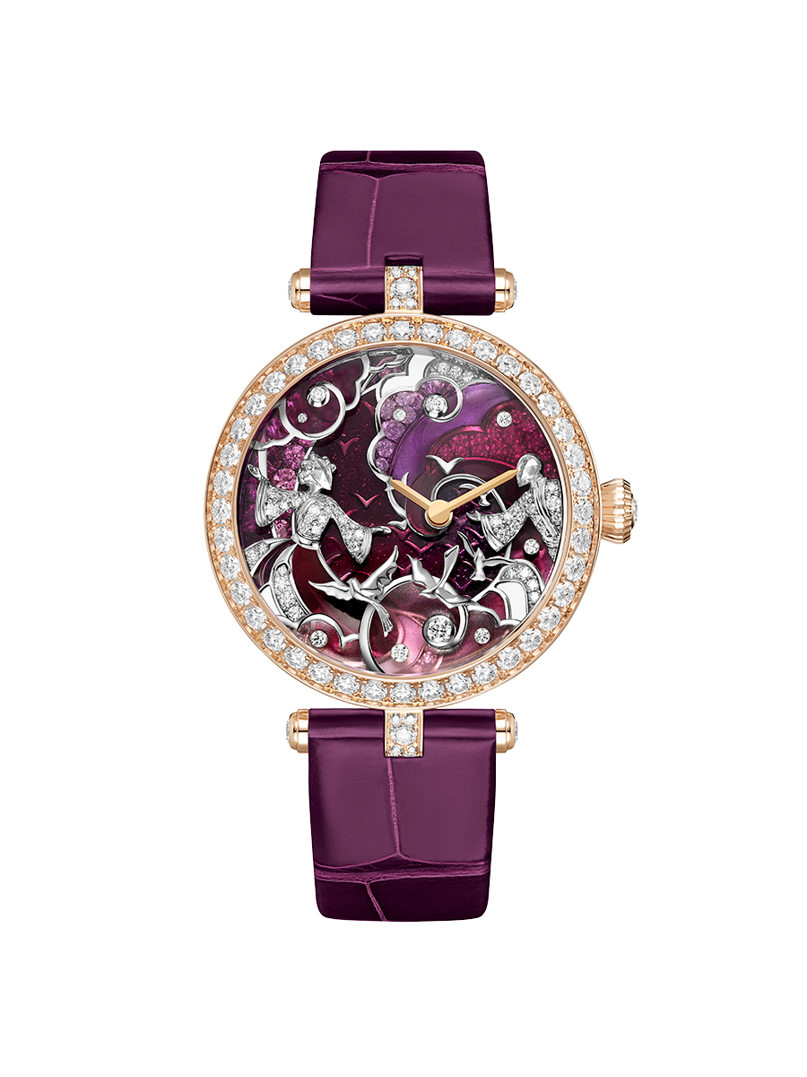 Đồng hồ Lady Retrouvailles Célestes hoàn thiện từ vàng hồng, vàng trắng, sapphire hồng, xà cừ trắng, kim cương, tráng men, vi họa và trang bị máy cơ lên dây thủ công.