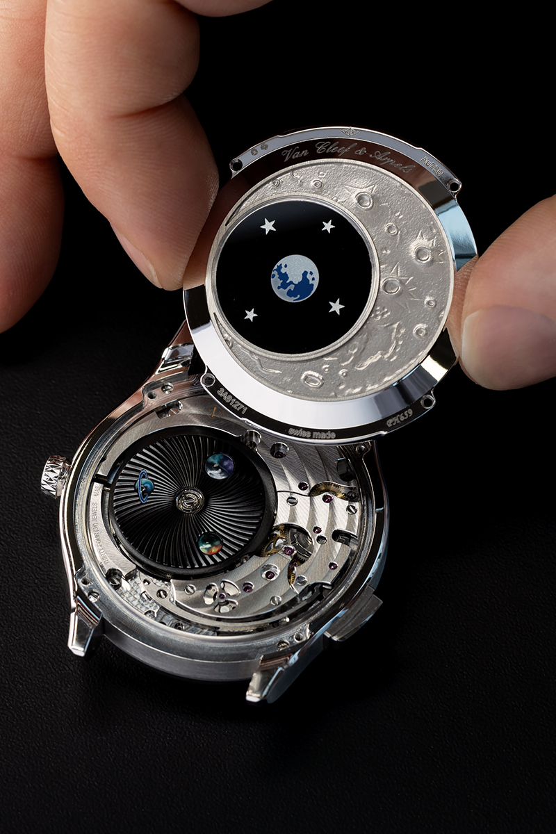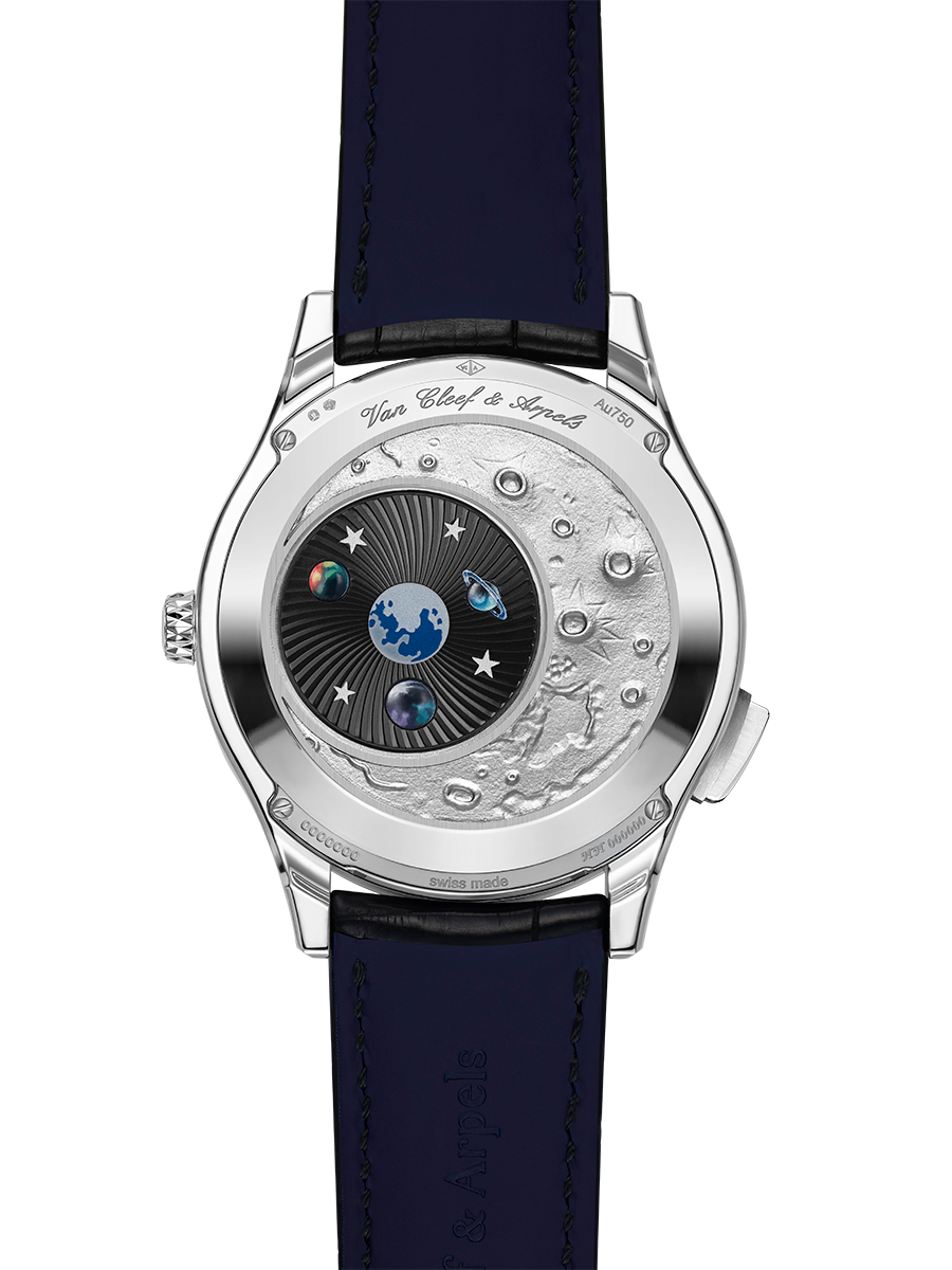 Câu chuyện tiếp tục ở phần nắp lưng, với hình khắc trên nền chất liệu vàng trắng gợi tả đến bề mặt Mặt Trăng. Trái Đất được thể hiện bằng đường viền tráng men trên mặt kính sapphire đặt phía trên rotor quay. Lớp kính sapphire này cũng được điểm xuyết các hành tinh được thực hiện bằng nghệ thuật vi họa, lấp lánh dịu dàng trên nền guilloché. Nắp lưng của mẫu đồng hồ có góc nhìn đảo ngược so với mặt số, miêu tả vũ trụ không phải từ Trái Đất, mà từ chính Mặt Trăng.