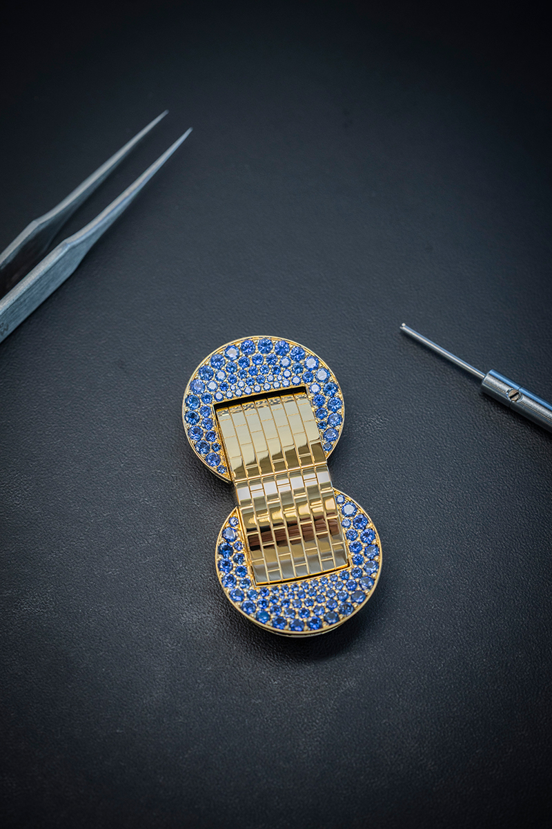 Phiên bản Ludo Secret mới với chất liệu sapphire tiếp nối truyền thống ấy khi tái diễn giải một mẫu nguyên bản ra đời năm 1949. Tạo tác ôm lấy cổ tay bằng dây đeo dạng mắt vàng “briquette” được đánh bóng như gương, lắp ráp và điều chỉnh hoàn toàn thủ công. Liên kết trong một cấu trúc lưới mềm mại, từng mắt xích trông như được dệt thủ công với độ tinh xảo hiếm thấy. Ánh vàng rực rỡ của kim loại quý hòa cùng sắc xanh đậm của sapphire trong một cuộc đối thoại tương phản hết sức hài hòa. Đặt trên nền chất liệu vàng, những viên đá quý tạo thành các họa tiết bán nguyệt đầy đặn. Khi ấn đồng thời vào hai bên của “khóa” trang sức, mặt số xà cừ trắng guilloché sẽ hiện ra. Hoàn thiện cho vẻ thanh nhã ấy là một viên sapphire cắt baguette đóng vai trò cọc giờ 12 giờ.