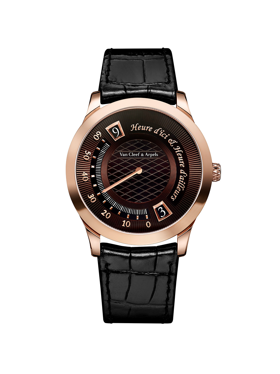 Midnight Heure d’ici & Heure d’ailleurs chế tác từ vàng hồng, tráng men, trang bị bộ máy tự động hiển thị hai múi giờ với hai cửa sổ jumping-hour và cơ chế retrograde-minute.