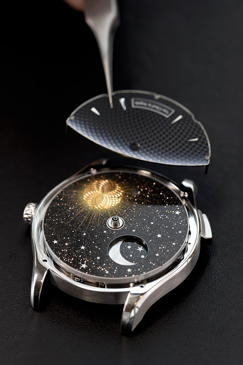 Thành tựu kỹ thuật này còn đi kèm yêu cầu tối ưu trọng lượng của các đĩa xoay, nhằm giúp chuyển động diễn ra nhẹ nhàng và hạn chế ma sát. Qua nhiều tháng thử nghiệm, các nghệ nhân đã tạo nên một hoạt cảnh chuyển động theo yêu cầu cực kỳ mượt mà, cho phép chủ sở hữu quan sát chu kỳ Mặt Trăng bất cứ khi nào mong muốn. Những bộ phận cấu thành mặt số cũng được làm mỏng hơn, nhằm gìn giữ trọn vẻ sâu hút của khung cảnh trên mặt đồng hồ. Thiết kế công thái học toàn diện còn bao gồm hệ thống chỉnh giờ và điều chỉnh lịch tuần trăng đều có thể thực hiện qua núm vặn.