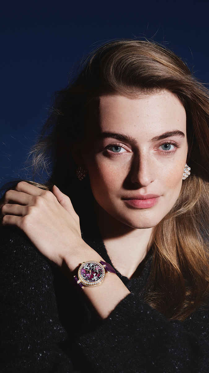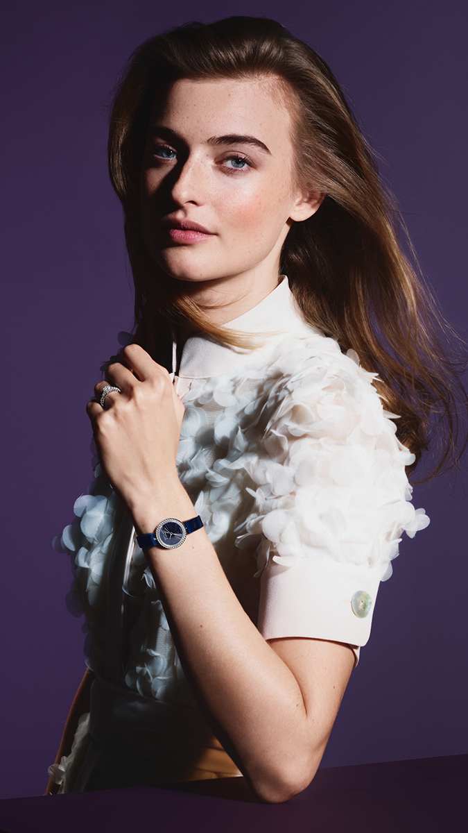 Viền ngoài của bộ vỏ được đính kim cương pavé đối xứng với vòng flange, nơi cũng sử dụng những viên kim cương do các chuyên gia ngọc học của Maison tuyển chọn theo những chuẩn mực khách quan cao nhất về chất lượng. Một nút bấm ở nắp lưng cho phép chỉnh giờ nhưng vẫn ẩn đi một cách kín đáo khi đeo trên cổ tay. Đồng hồ đi kèm dây da cá sấu có thể thay thế, cùng một dây thứ hai tùy chọn trong bảng màu khác nhau của bộ sưu tập. Dễ dàng cài và tháo gỡ, các dây đeo có thể thay đổi tùy theo tâm trạng và phong cách của người đeo.